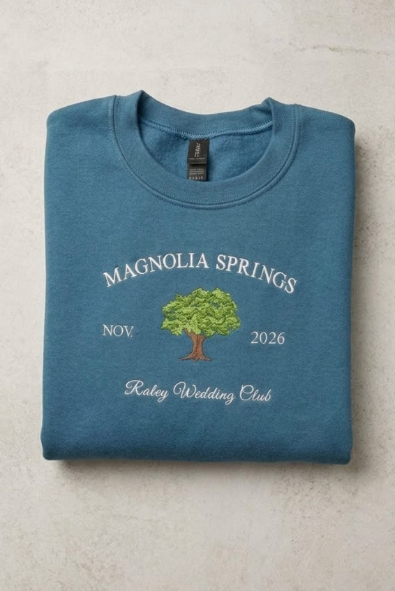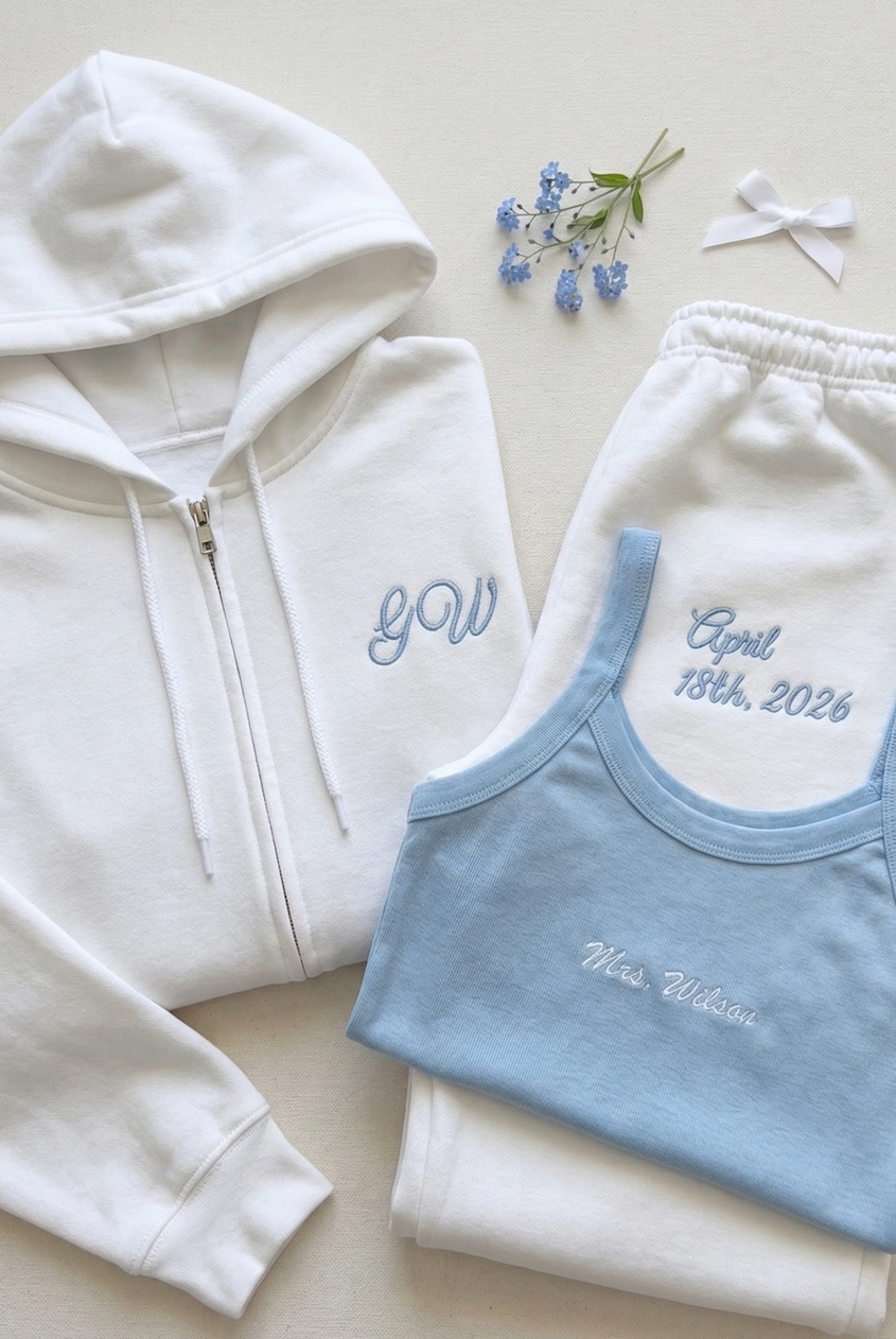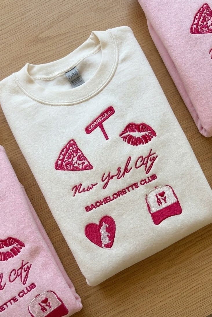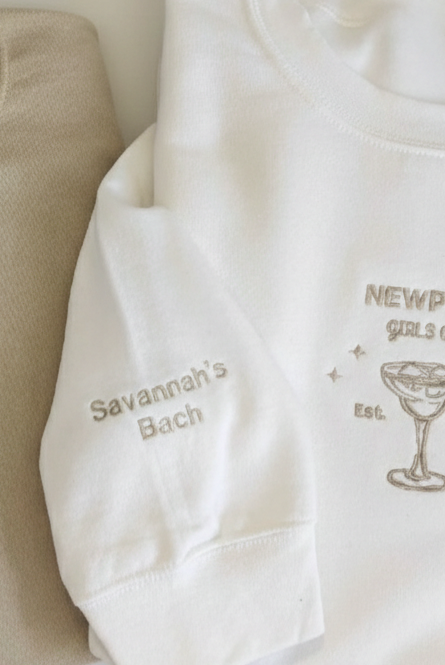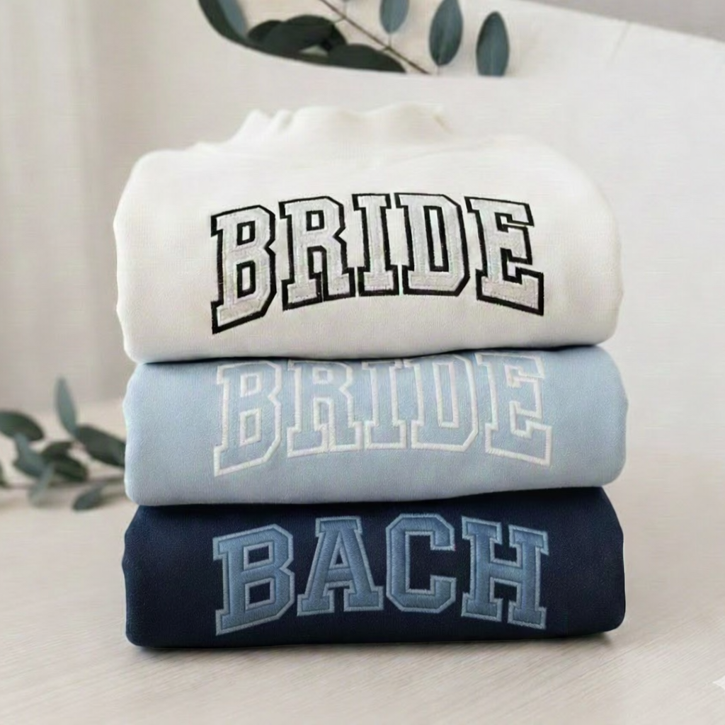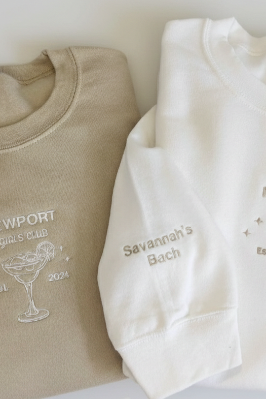 Every custom bachelorette sweatshirt we make is thoughtfully designed, digitized, and embroidered by hand. From your initial inquiry to the final stitch, our process is collaborative and detail-driven—never mass-produced or printed.