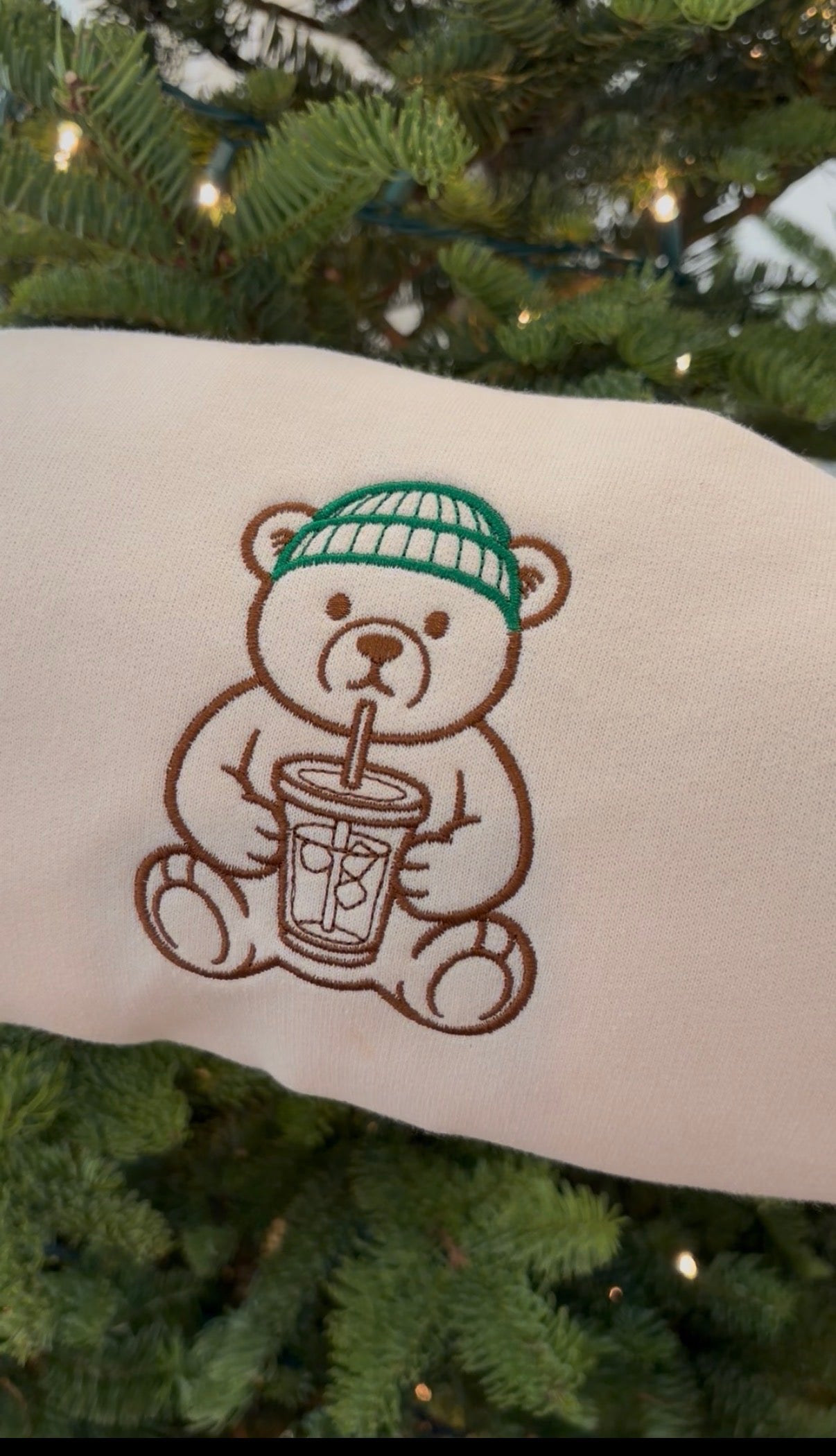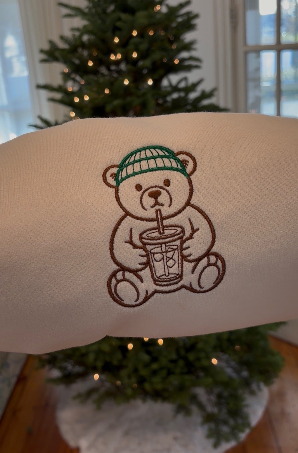 • Cream crewneck with brown Christmas Coffee Bear embroidery